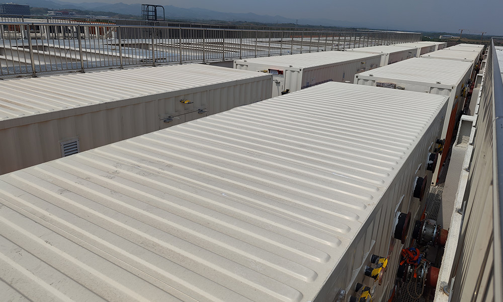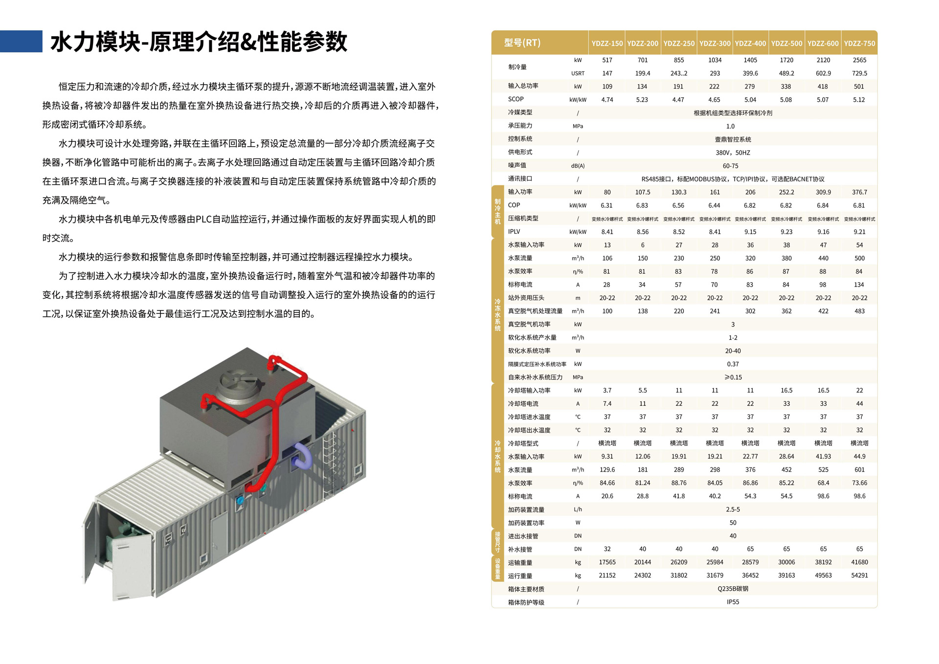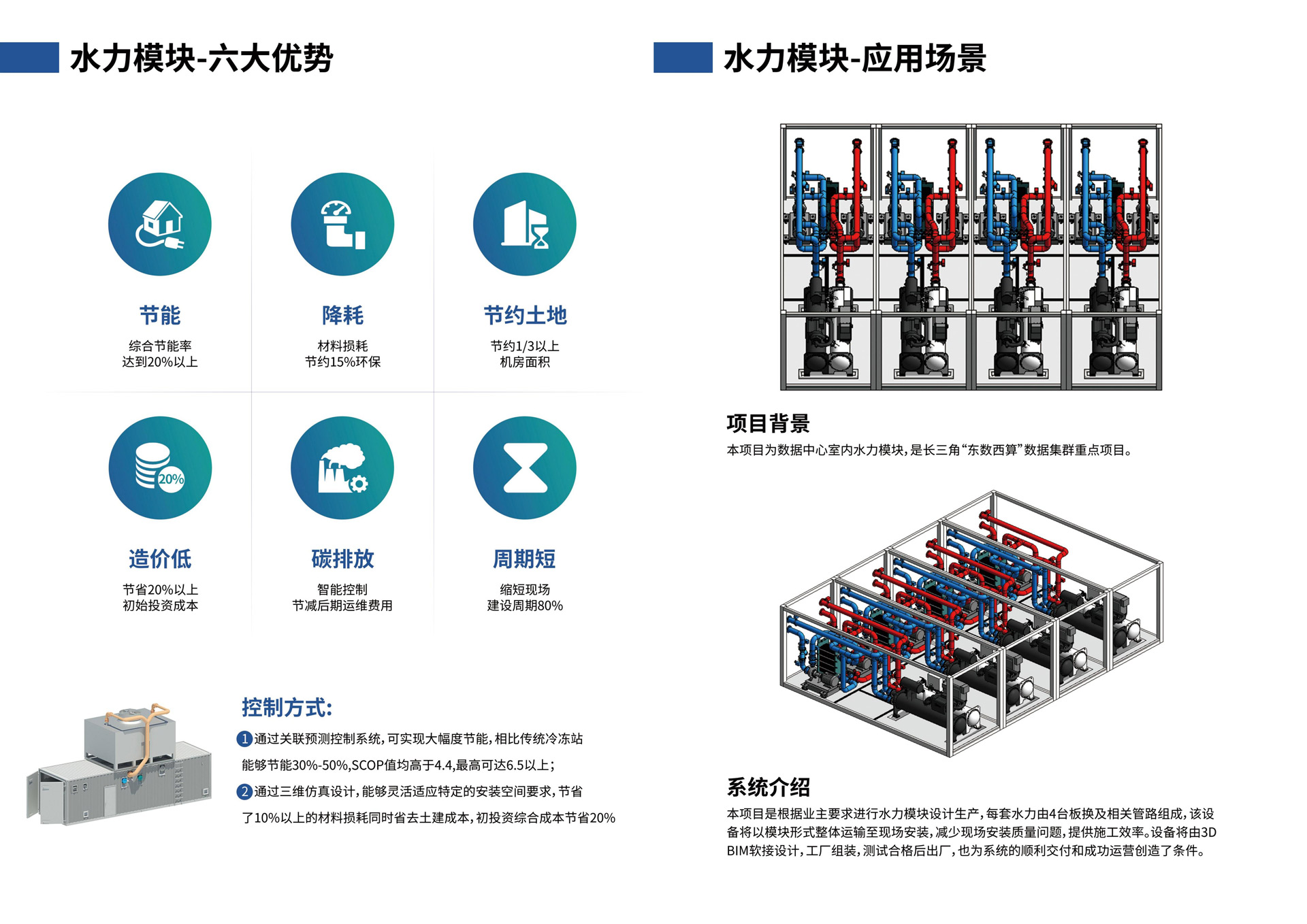 2.模块化水冷预制舱内集水冷机组、、、变频水泵、、水处理装置及电气控制等设备为一体,,,,系统根据实际运行工况自动调节水流量,,,,稳定的输出冷量,,预制舱自带控制系统自动调节。。。